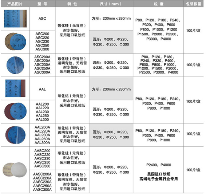 二、产品特点1、具有耐水性,磨料有白刚玉(氧化铝)、碳化硅、以及混合磨料。