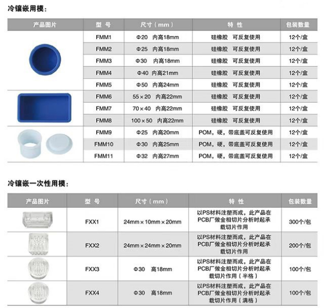 一、产品介绍 1、冷镶嵌用模:配合冷镶嵌料使用,根据不同直径和不同形状,选择适用模具进行镶嵌。 2、冷镶嵌一次性用模:此产品主要使用在PCB厂做金相切片分析时起承载切片的作用,